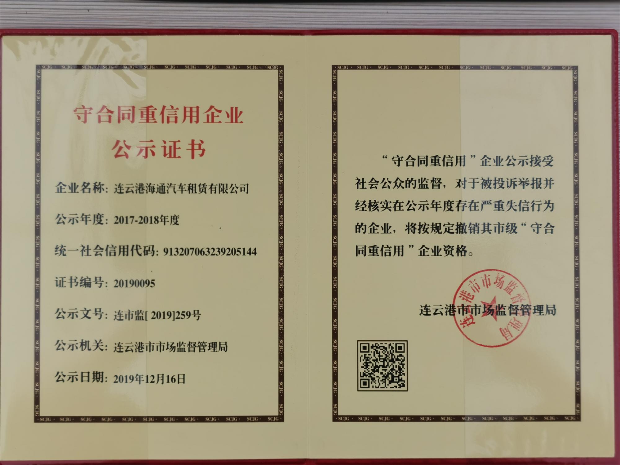 2020年7月8日,汽車(chē)租賃事業(yè)部獲得了由連云港市市場(chǎng)監(jiān)督管理局授予的“守合同重信用企業(yè)”公示證書(shū)。獲此殊榮,既是對(duì)汽車(chē)租賃事業(yè)部在合同履約及企業(yè)誠(chéng)信建設(shè)中所取得成績(jī)的肯定,也有助于企業(yè)進(jìn)一步增強(qiáng)市場(chǎng)競(jìng)爭(zhēng)力,提升企業(yè)對(duì)外形象。租賃公司自成立以來(lái),始終恪守誠(chéng)信服務(wù)的理念。堅(jiān)持以誠(chéng)取信,以信立譽(yù)的原則,同時(shí)堅(jiān)持實(shí)事求是,確保守合同重信用的信念深入每個(gè)員工心中,并始終堅(jiān)持靠誠(chéng)信贏(yíng)得客戶(hù)的信賴(lài)、靠信譽(yù)和質(zhì)量贏(yíng)得市場(chǎng)的發(fā)展。