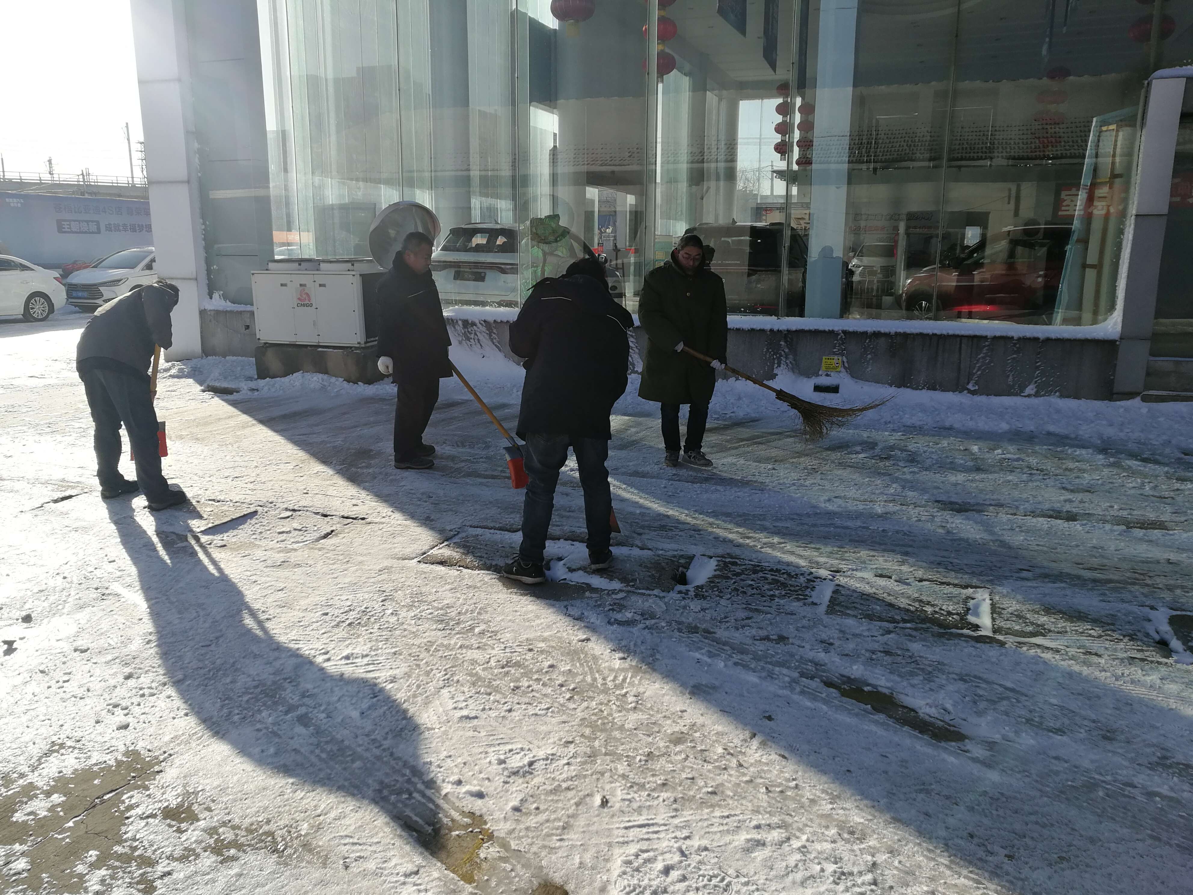 受強(qiáng)冷空氣影響,12月29日,連云港市迎來了一場突如其來的大雪。根據(jù)集團(tuán)和上級公司有關(guān)低溫雨雪冰凍天氣安全工作精神,30日上午一上班,修理事業(yè)部各公司就紛紛展開積雪清掃活動。在清掃隊伍中,有公司領(lǐng)導(dǎo)、有勞模、有黨員、有普通職工。大家利用各種工具,對各自轄區(qū)的積雪進(jìn)行了認(rèn)真清理。經(jīng)過一夜的低溫,雨雪已經(jīng)結(jié)冰,對清掃工作造成很大的難度,積雪清掃效果并不理想。下午時分,氣溫有所提升,部分積雪已經(jīng)融解,事業(yè)部各單位又紛紛行動,繼續(xù)展開積雪清掃活動。隨著時間的推移,在大家的努力下,地面冰雪一點點得到清理,逐步清理出一條便于車輛和行人出行的干凈路面。