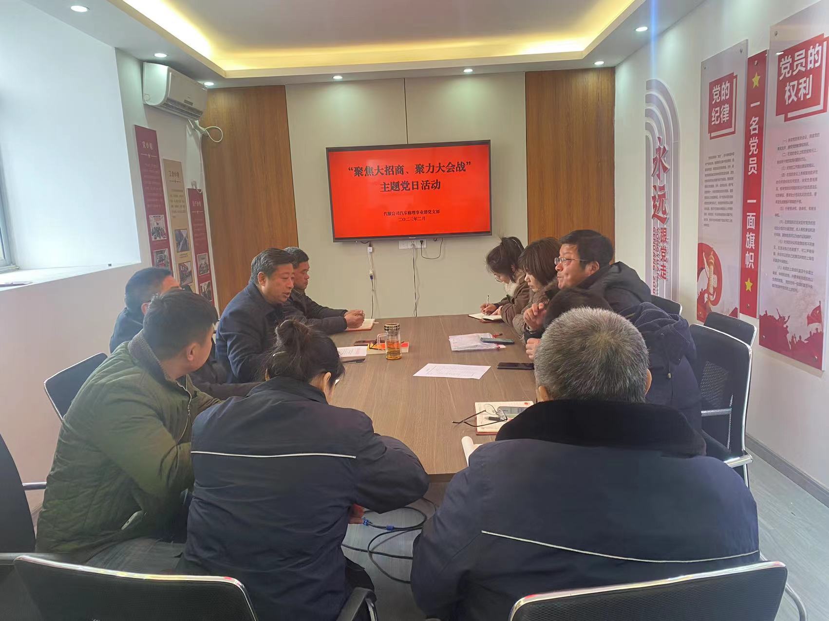 為深入學(xué)習(xí)貫徹黨的二十大精神,將公司黨員干部的思想、行動(dòng)統(tǒng)一到市委“招商引資、項(xiàng)目建設(shè)大會(huì)戰(zhàn)”的部署上來(lái),引導(dǎo)廣大黨員把學(xué)習(xí)二十大精神的成果轉(zhuǎn)化為投身于公司高質(zhì)發(fā)展的實(shí)際行動(dòng)。近日,汽服公司黨委組織各基層支部開(kāi)展“聚焦大招商、聚力大會(huì)戰(zhàn)”主題黨日活動(dòng)。