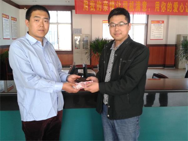 據(jù)了解,4月23日上午9時(shí)許,在上海工作的孫先生在連云港火車站乘坐一輛出租車前往東盛名都廣場(chǎng)。由于和客戶約定的時(shí)間比較急,一到目的地,孫先生就匆忙付了打的費(fèi)下了車,他并沒(méi)有意識(shí)到自己隨身攜帶的錢包掉在了車上。據(jù)悉,錢包里不僅有3600多元的現(xiàn)金,還要身份證、駕駛證和銀行卡等重要證件!板X包丟了,我身無(wú)分文,連最基本的吃飯和住宿都成了大問(wèn)題。補(bǔ)辦那些證件需要一定的時(shí)間,肯定會(huì)給我的工作和生活造成非常大的麻煩。當(dāng)時(shí)下車時(shí)雖然留了打車發(fā)票,但是我不清楚如何分辨發(fā)票上的內(nèi)容。由于出租車存在一定的流動(dòng)性,我更不敢保證錢包不被出租車上其它的乘客撿走。萬(wàn)般無(wú)賴之下,我想到了向110求助,可是讓我沒(méi)想到的是,不一會(huì)兒,我就被告知我的錢包已經(jīng)被出租車師傅交到了連汽出租車公司的服務(wù)中心,我隨時(shí)都可以到服務(wù)中心領(lǐng)回自己的錢包。連汽出租公司和110能這么及時(shí)、快速的幫助我找回丟失的錢包,我只能用一個(gè)詞來(lái)形容整個(gè)事情的經(jīng)過(guò):完美!睂O先生表示。