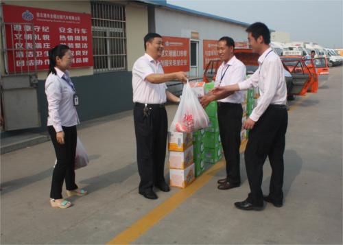 七月流火、蟬鳴陣陣。又是一年酷暑時(shí)期,在夏日炎炎的天氣下,全福公司工作在一線安全管理員頂著高溫,耐著酷暑,堅(jiān)守著自己的崗位,認(rèn)真仔細(xì)地檢查每一臺(tái)車輛,對(duì)發(fā)現(xiàn)的隱患及時(shí)進(jìn)行排查整改。為了關(guān)心工作人員的身心健康,保證企業(yè)安全生產(chǎn), 7月15日上午,汽服公司總經(jīng)理趙士強(qiáng)、黨委書記劉元祥、工會(huì)主席趙明親切慰問了奮戰(zhàn)在一線的工作人員,并給他們送去白糖、綠豆、綠茶、等降溫防暑慰問品。