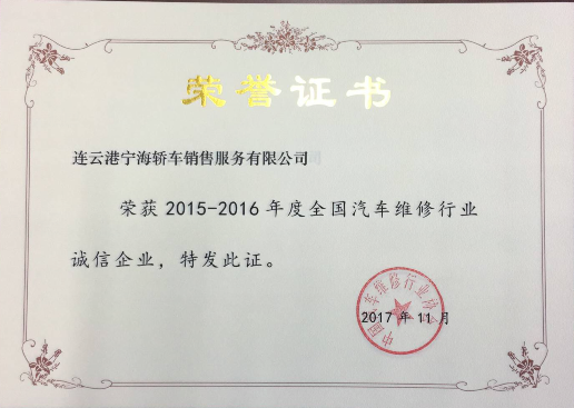 為持續(xù)推動汽車行業(yè)誠信建設(shè)的發(fā)展,2017年4月份,中國汽車維修行業(yè)開展2015-2016年度汽車維修行業(yè)誠信企業(yè)評選活動。經(jīng)過企業(yè)申請,各地評估、推薦,協(xié)會審查、公示等程序,全國共884家維修企業(yè)被授予“2015-2016年度全國汽車維修行業(yè)誠信企業(yè)”稱號,寧海公司名列其中。